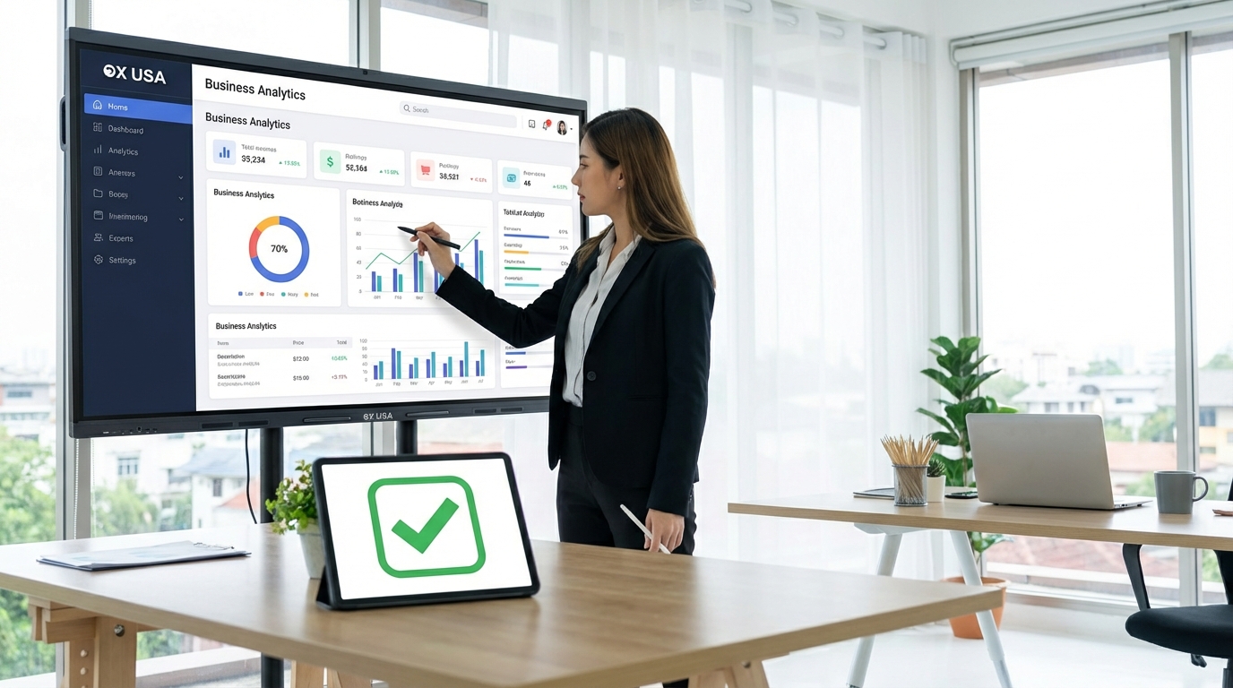 تستبدل OX USA البروجيكتور، والسبورة، ومكبرات الصوت، والكمبيوتر، والكاميرا، والتوصيلات بشاشة تفاعلية واحدة.